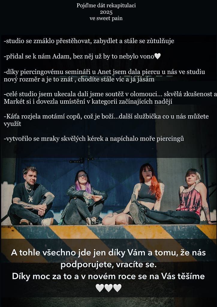 Naše studio Sweet Pain Tattoo & piercing bylo založeno v roce 2015 tatérkou a piercerkou Valerií. Studio je na rušné ulici Dr. M. Horákové, ale s možností parkování v areálu.